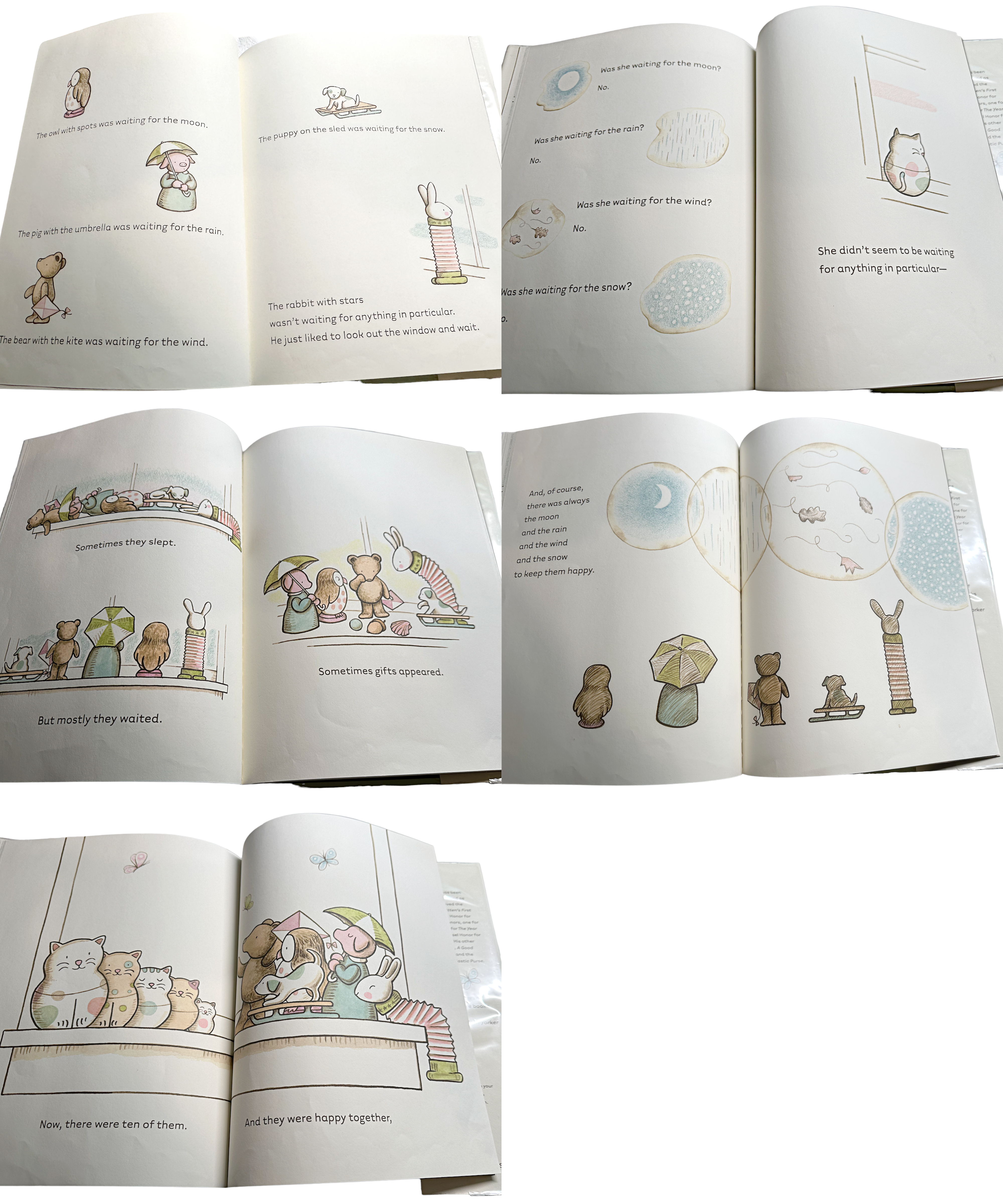 창문 틀에 앉아 무엇인가를 기다리는 듯한 다섯 명의 장난감들이 표지를 장식한다. 이들은 무엇을 기다릴까? 부엉이는 달을. 우산을 쓴 돼지는 비를. 썰매에 앉아 눈이 오기를 기다리는 강아지. 연을 날리고 싶어 바람을 기다리는 곰. 마지막으로 밖을 내다보며 밖에서 무슨 일이 있나를 감상하는 토끼까지, 이들은 각자 원하는 것을 기다리는 중이다. 이 들이 기다리는 동안 방문객이 찾아오기도 한다. 한 두명이 가끔씩 사라졌다 돌아오곤 한다. 다시 돌아오지 않는 코끼리도 있다.
